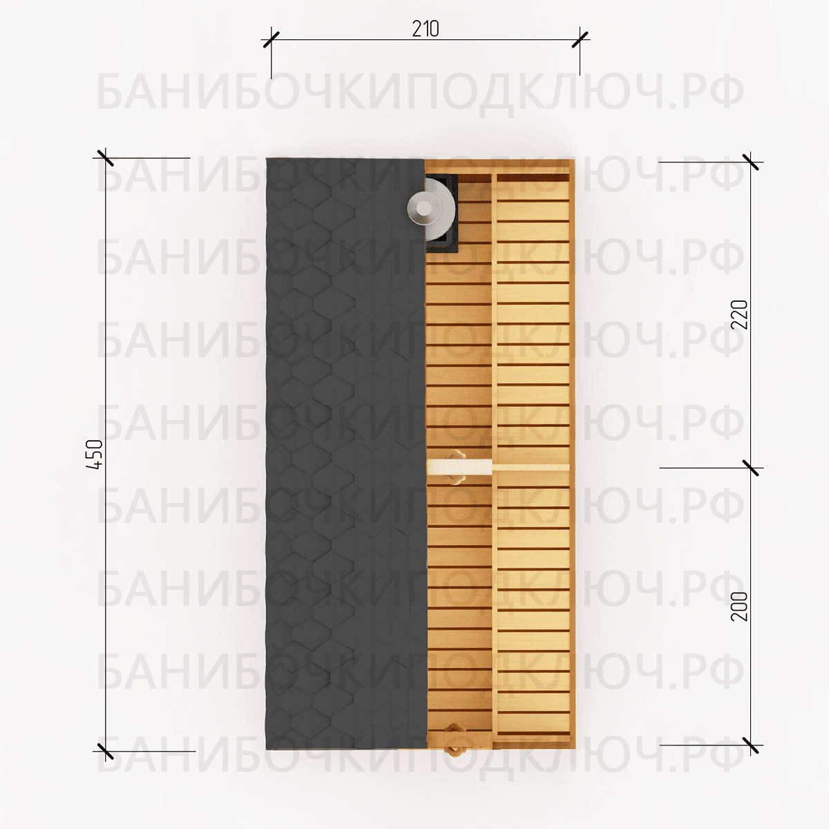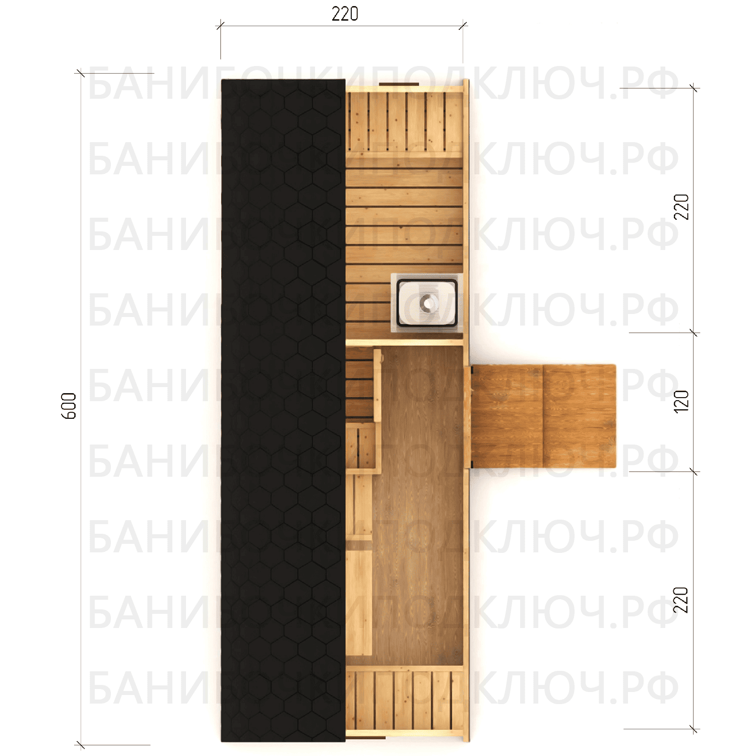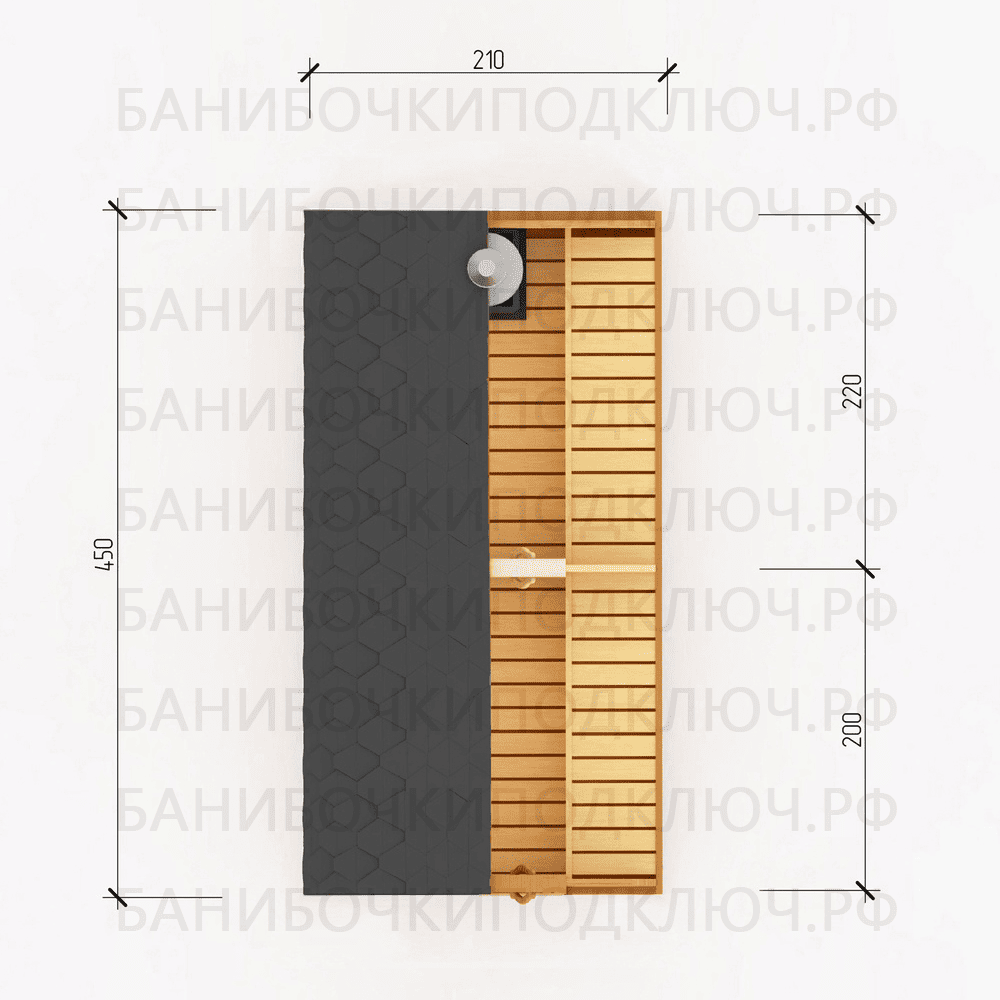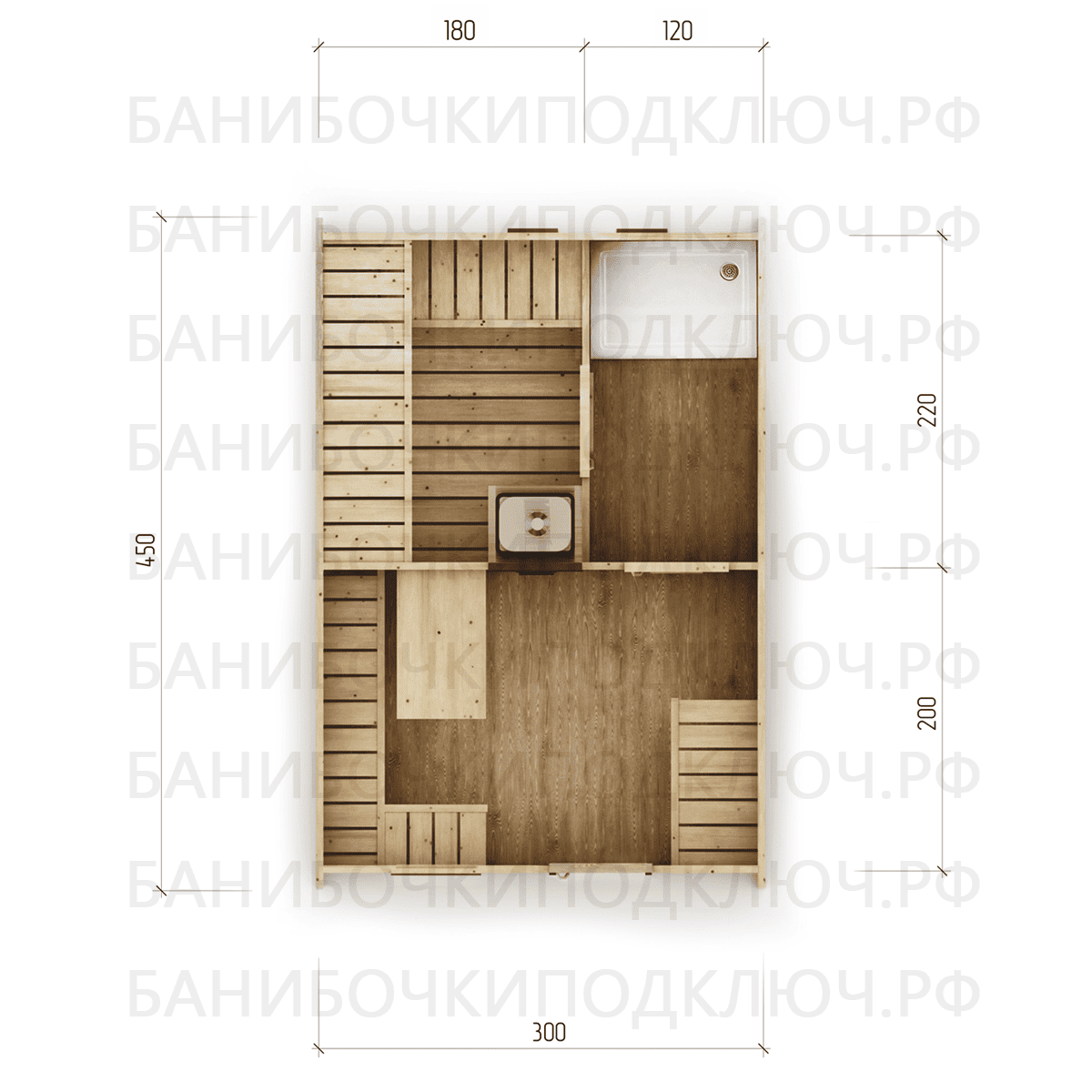 комната отдыха – 200х300, парная 180х220, мойка 120х220