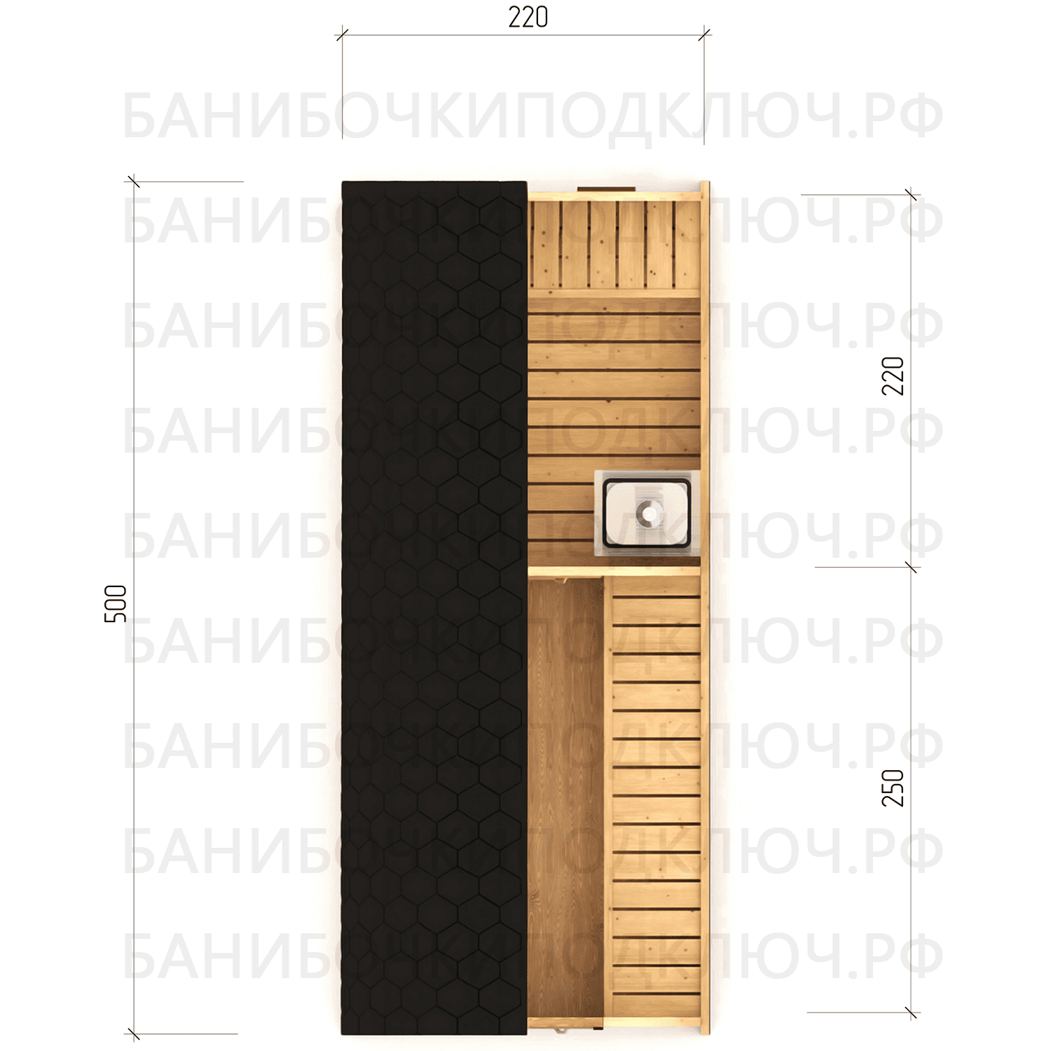 парилка - 220 см, предбанник - 150 см