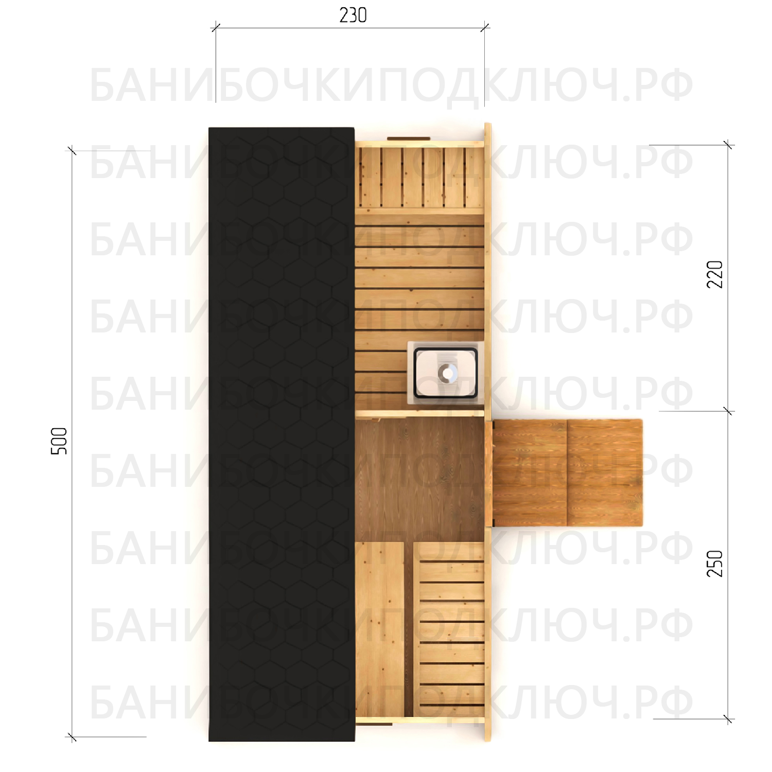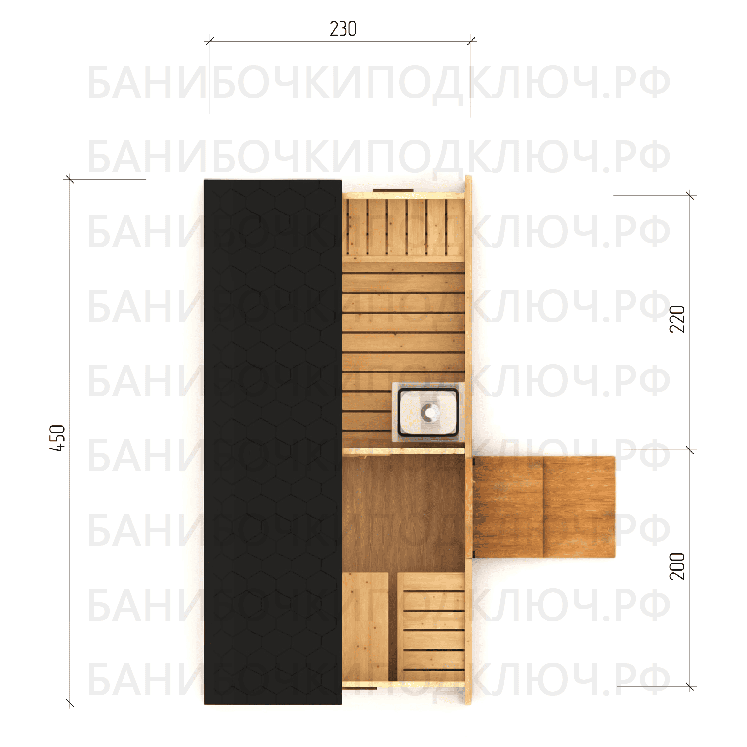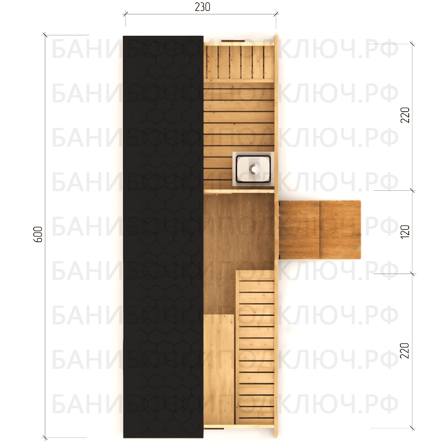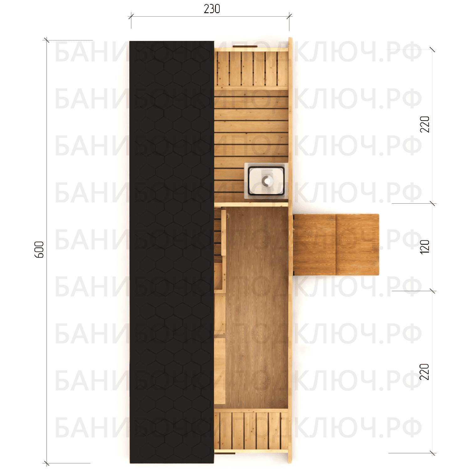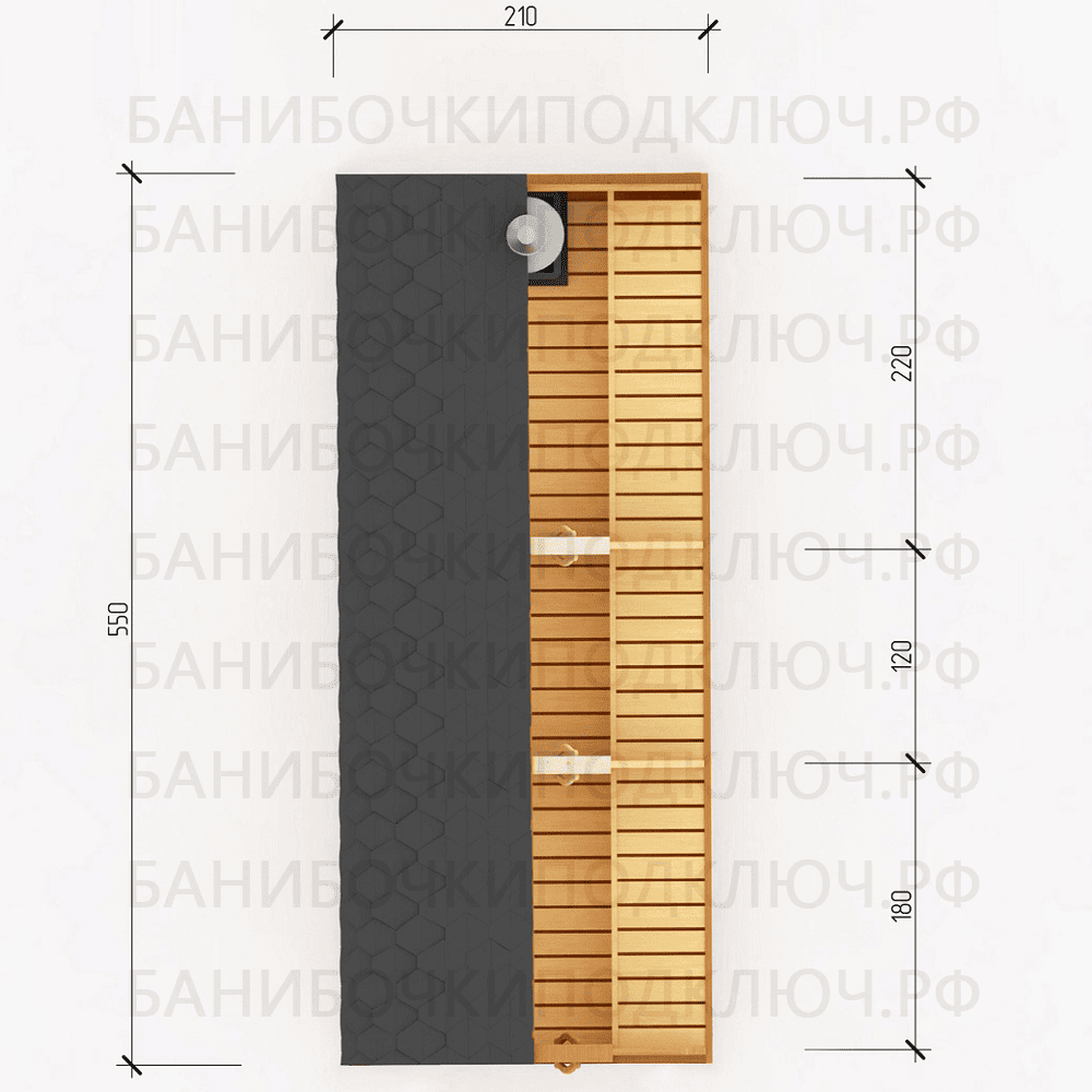 парилка - 200 см, предбанник - 120 см