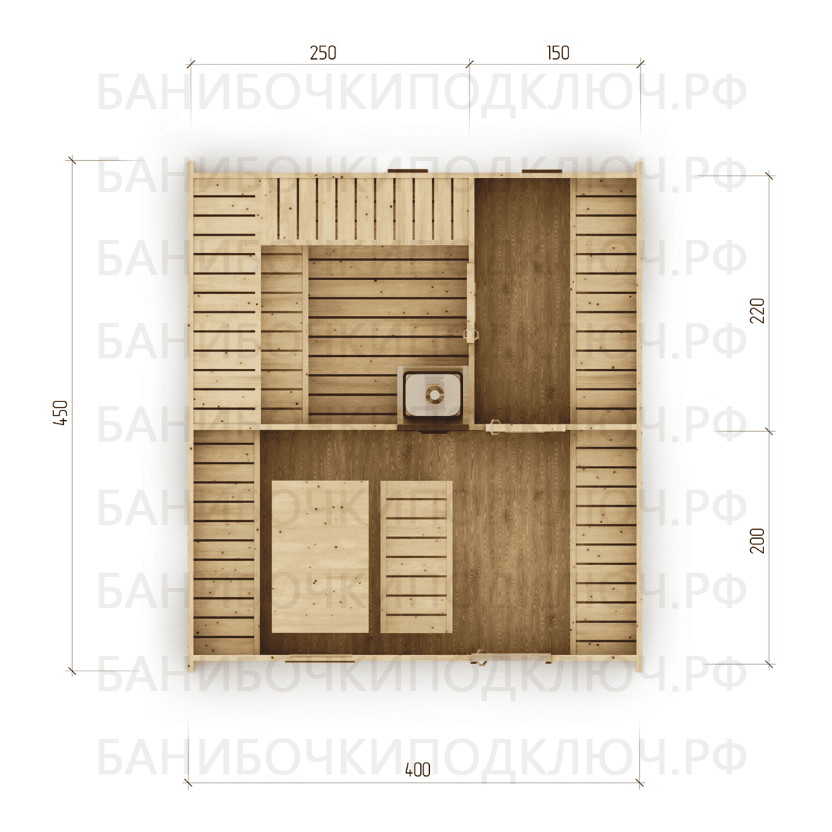 комната отдыха – 200х400, парная 250х220, мойка 150х220