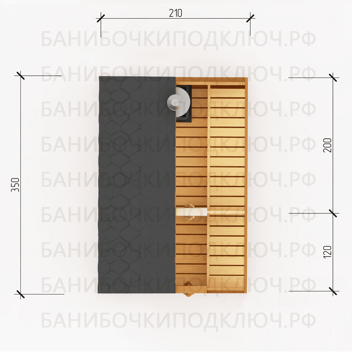 комната отдыха – 350х280, парная 250х280, мойка 290х350, душевая - 120x250, раздевалка 150x250